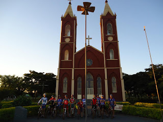 Ontem foi dia de pedal. Os amigos Altair, Alcinei, Augusto (ciclista de estrada da equipe rondonense), Eurídes, Edilson, Gustavo, Lírio, Marcondes, Nico, Paulo e Sonda realizaram um trajeto misto de rodovia e estradas rurais. O destino foi cruzar a linha Arapongas em Novo Sarandi (Toledo) até Vila Ipiranga (Toledo). Esse trecho foi quase inteiro em estrada rural. Mas antes disso, o grupo cruzou por Quatro Pontes e Novo Sarandi pela rodovia. Em Vila Ipiranga o grupo encontrou o jovem Thiago que por lá passava e tirou as fotos em frente ao cartão postal do distrito: a igreja Católica Matriz (foto). Depois ele aparece nela.